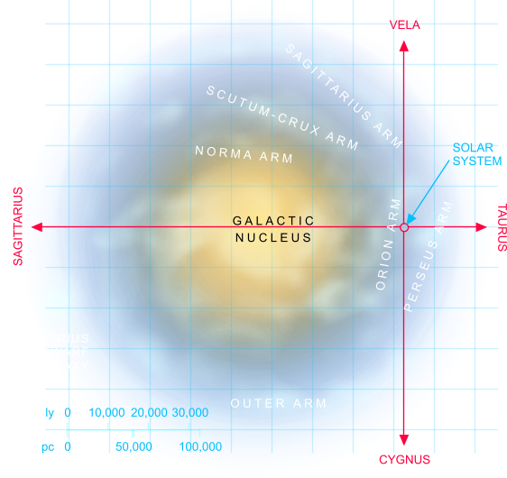 In comparison with other galaxies, the Milky Way is unremarkable. Its disc is about 100,000 light years across, or perhaps a little more. This is an extraordinary dimension from our Earth-bound perspective, but not in comparison with other galaxies: the Andromeda Galaxy is roughly twice the size of ours, and other more distant galaxies are more gigantic still. In form, the Milky Way takes the shape of a gently barred spiral, with two especially prominent arms and numerous other minor arms within its structure.