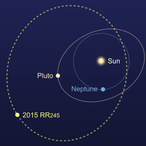 | Proper Name | None | | Minor Planet Designation | 523794 2015 RR245 | | Provisional Designation | 2015 RR245 | | Orbital Period | 731 years, 6 months | | Distance from the Sun | Semi-Major Axis: 12,421,051,000 km (83.03 AU) Perihelion: 5,113,909,000 km (34.18 AU) Aphelion: 19,728,192,000 km (131.87 AU) | | Eccentricity | 0.5883 | | Rotation Period | 8 hours, 21 minutes | | Diameter | c.670 km | | Moons | None known | | Parent star | The Sun, yellow dwarf | | Other planets in this system | Mercury, terrestrial planet Venus, terrestrial planet Earth, terrestrial planet Mars, terrestrial planet Jupiter, gas giant Saturn, gas giant Uranus, ice giant Neptune, ice giant Numerous dwarf planets, asteroids and other bodies