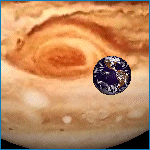 The majestic world of Jupiter, by far the largest of the Sun's family of planets. To the far right of this image is Jupiter's moonIo, a body almost exactly the same size as Earth'sMoon. The tiny shadow cast by Io can be seen in Jupiter's equatorial regions.