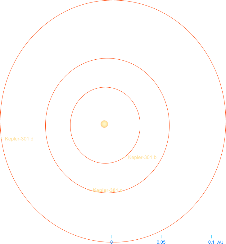 The Kepler-301 system consists of three known planets, each somewhat larger than Earth, with Kepler-301 c occupying the middle orbit of the three. All of these planets are orbiting extremely closely around their Sun-like star. For comparison, if the planet Mercury were part of this system, it would lie more than three times farther from the star than even the outer planet, Kepler-301 d.
