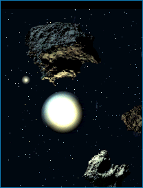 Hypothetical asteroid-like fragments in orbit around the star 77 Piscium A. Its optical companion, 77 Piscium B, lies some eight light years distant and is faintly visible in the background of this image.