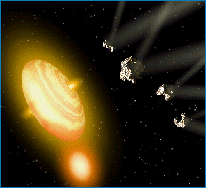 binary system of Lang-Exster or Alpha Tucanae. Each of the remaining fragments has two tails, as particles are blasted