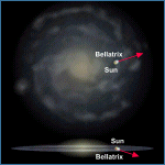 The Galactic position and direction of Bellatrix relative to Earth'sSun. Note that, at this extreme scale, the two stars are effectively in the same place.