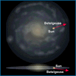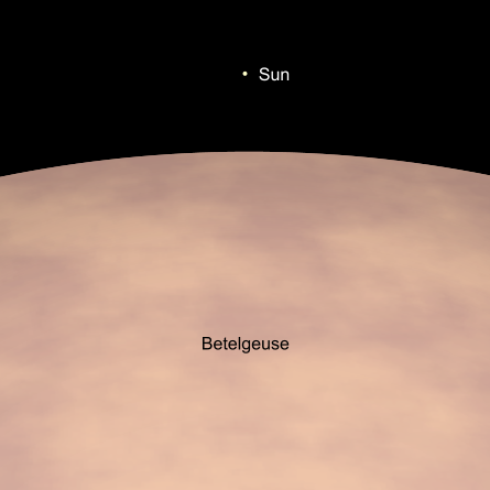 By comparison with the Sun, Betelguese is immense. Its outer diameter changes as its composition shifts over time, but it approaches some six hundred times that of the Sun.