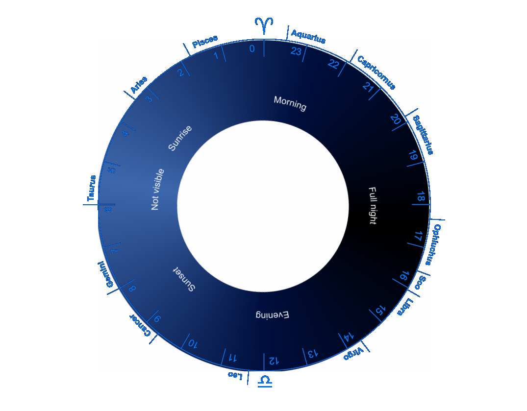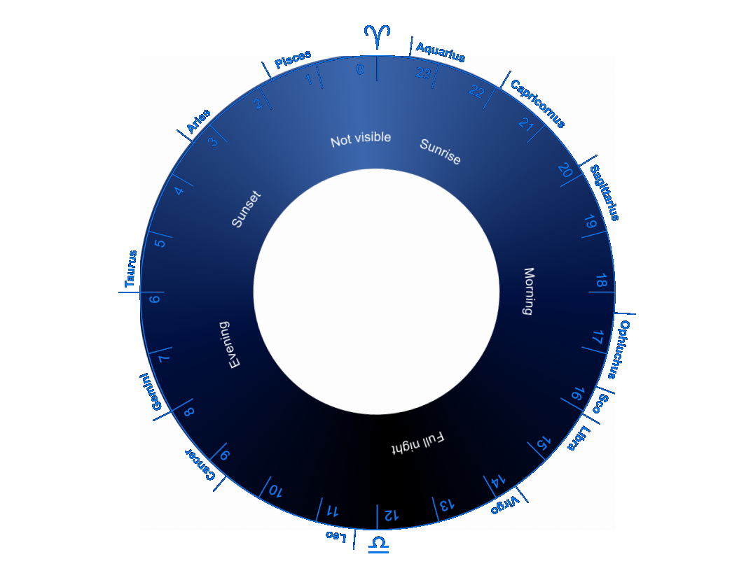 The nearer a planet is to the Sun in the sky, the less visible it becomes, and planets that are very close to the Sun in the sky are only above the horizon during the day, and so cannot be observed at all. So, planets shown in brighter part of the Wheel, near the Sun, are hard or impossible to see. Conversely, planets opposite the Sun on the Wheel are above the horizon for most of the night.